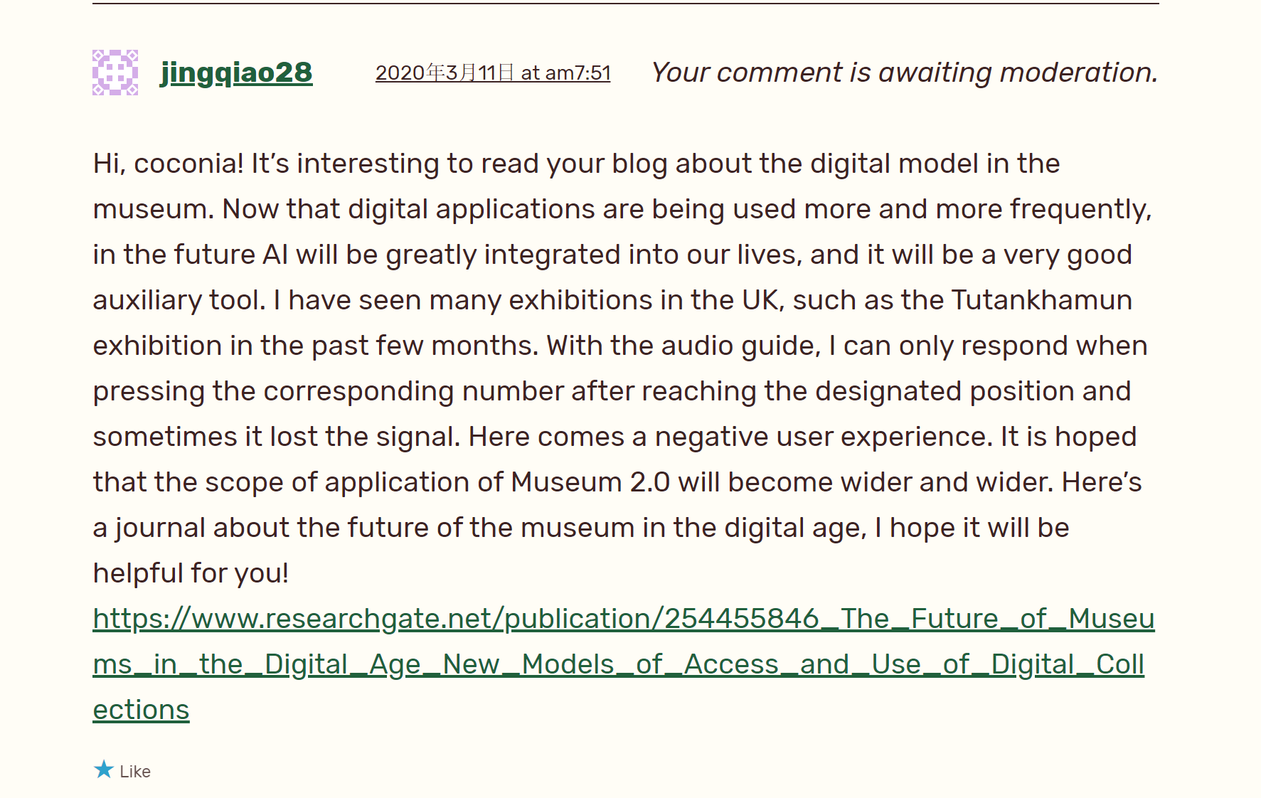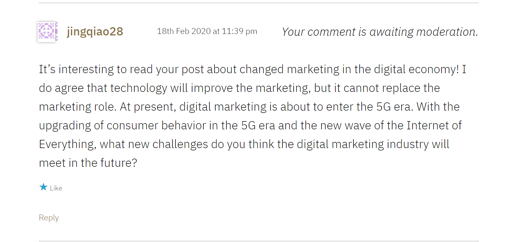 At the same time, I also actively participated in commenting on other people’s blogs and ELE. The first task about discuss the changed marketing in the digital economy, my blog content was slightly narrow. Debates about the impact of 5G on marketing from other colleagues’ blogs helped me improve my ability to think critically. This discussion and analysis made me better understand that each issue should be examined from both negative and positive aspects.