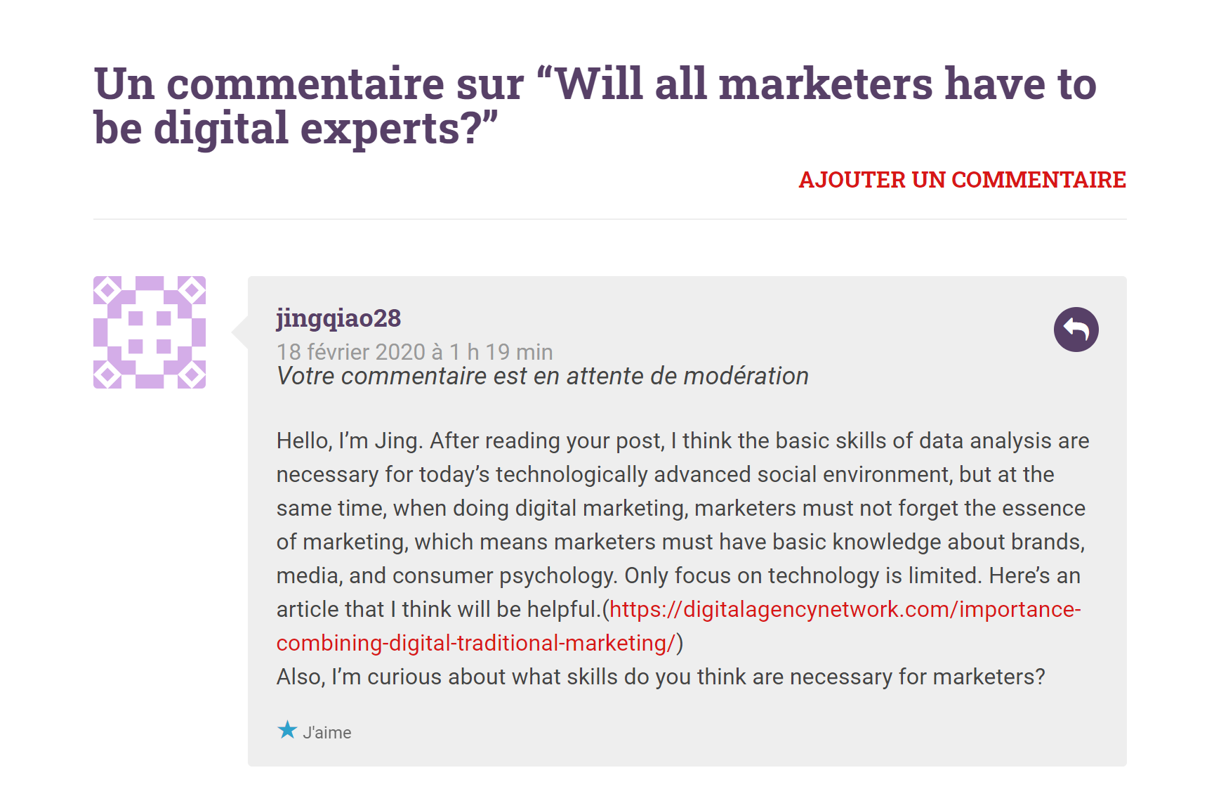 During the learning process, I published two blogs. The first one combined my own experience to discuss the difference between traditional marketing and digital marketing, and the impact of AI technology on future marketing. The second blog analyzed the reasons for Taobao’s success through the perspective of business model and SMAC. Through my colleagues’ comments on the blogs, I have gained more perspective viewpoints and deepened my understanding of the topic.